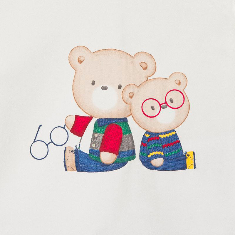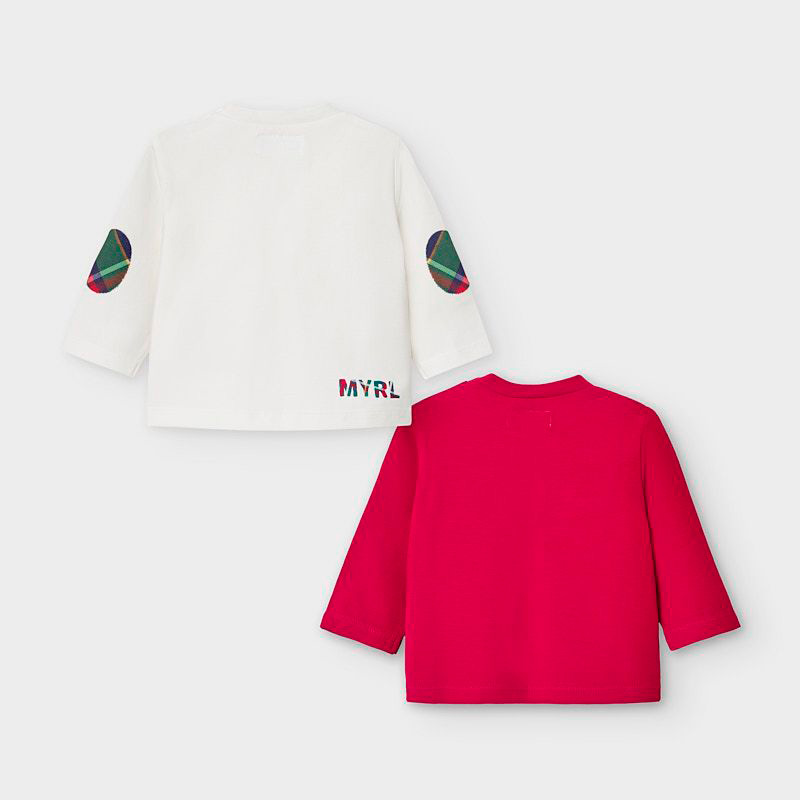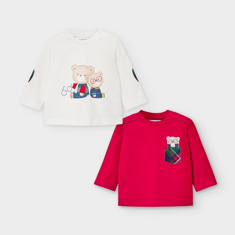 Set due t-shirt MAYORAL in caldo cotone invernale. Apertura laterale sulla spalla. Color panna con stampa centrale con orsetti e color rosso con finto taschino e orsetto.
