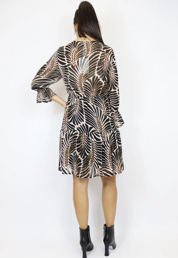 Vestito con scollo a V, manica 3/4 con elastico e gonna con balza.