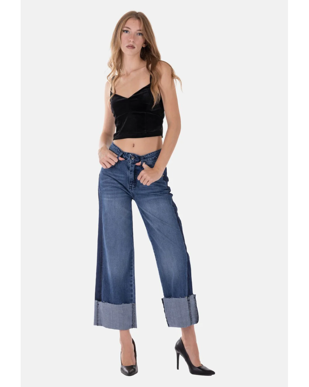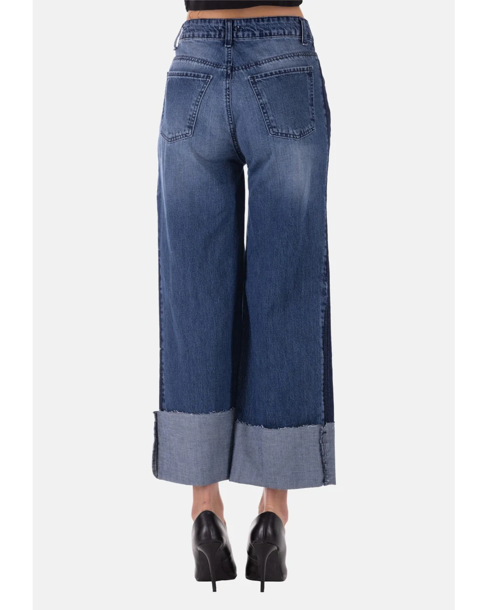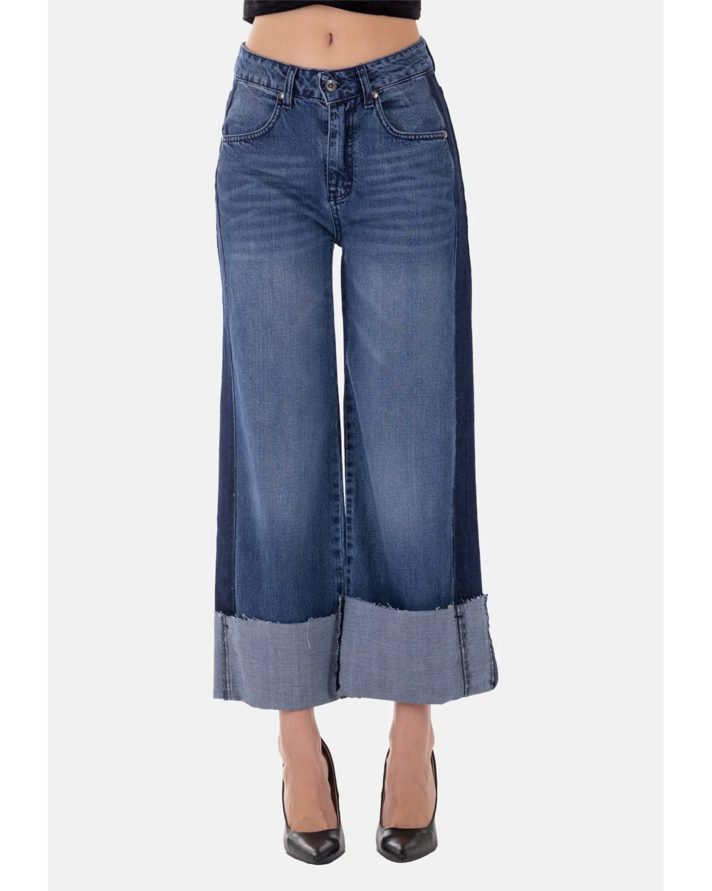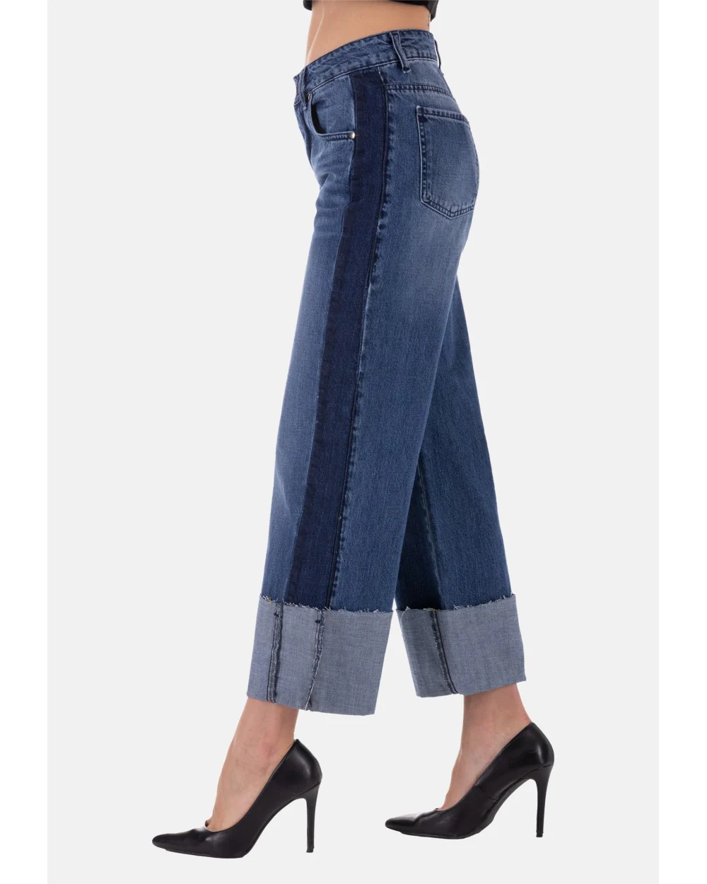susy mix donna jeans E506 PALAZZO VITA ALTA FONDO AMPIO CON BANDE LATERALI E RISVOLTO A CONTRASTO