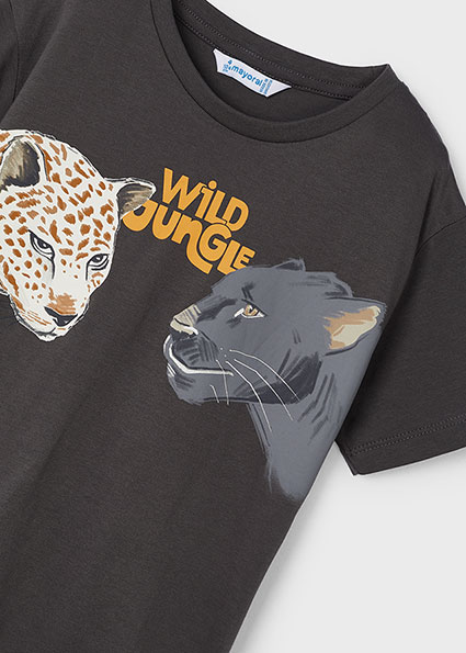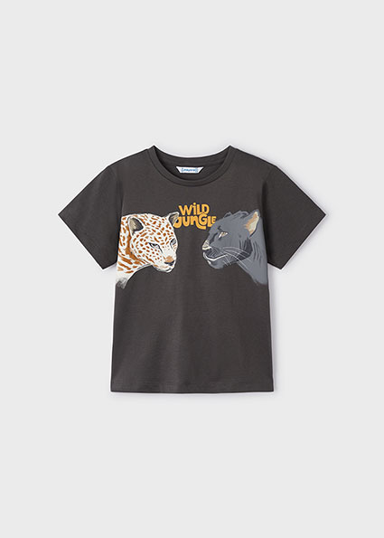 T-shirt MAYORAL per bambino daย 3 a 9ย anni. Modello girocollo e mezza manica. Color grigio con stampa centrale animali della giungla.