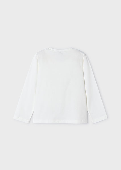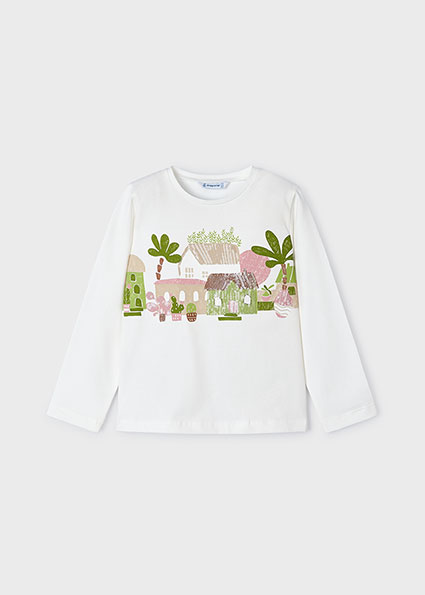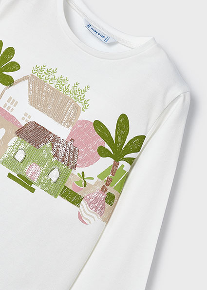 T-shirtย MAYORAL primaverile e manica lunga per bambina da 3 a 9 anni. Modello girocollo color panna con dettagli in rilievo verdi e paillettes decorative.