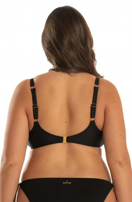 Top bikini brassiere con nodo centrale senza imbottitura e sottoseno decorativo full strass. Realizzato in morbida lycra matte tinta unita, collezione Curvy Mix&Match.