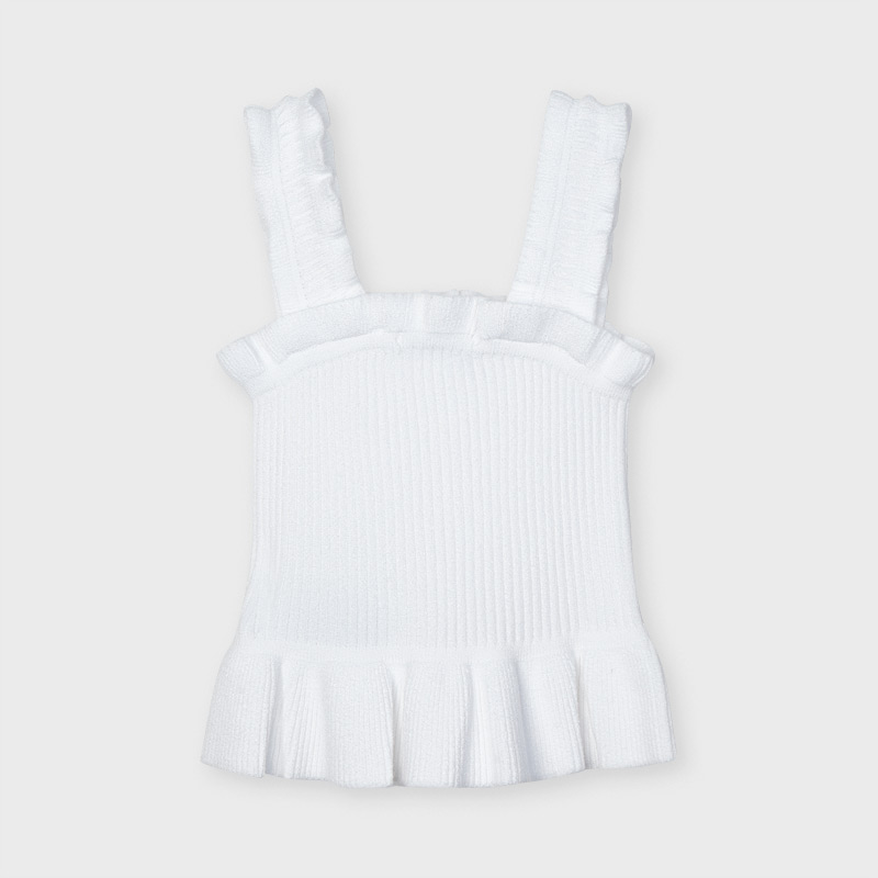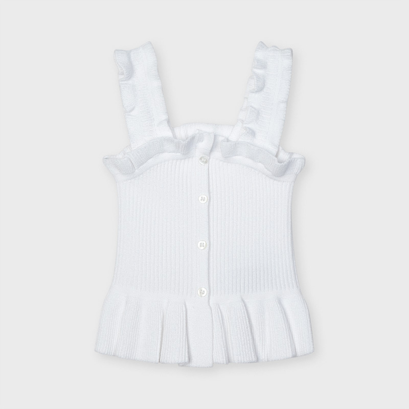 Top MAYORAL, modello ECOFRIENDS contenente LENZING TM ECOVERO TM. Top con bretelle per bambina da 2 a 9 anni. Tessuto morbido ed elasticizzato per una comoditร giornaliera. Design con volant decorativo nella parte bassa. Elementi decorativi: bottoni decorativi. Color bianco con design a costine.