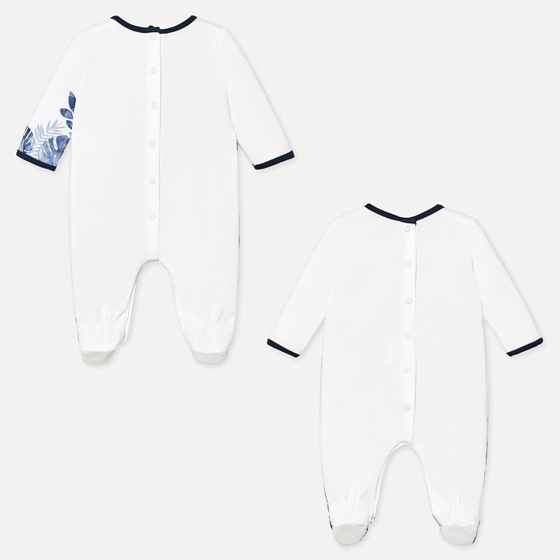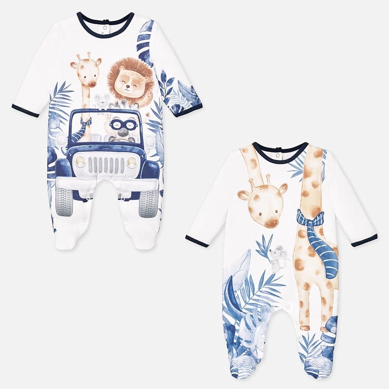 Set di due pigiamini MAYORAL, manica lunga, color bianco e blu con graziosa stampa di animaletti. Questo articolo viene spedito all’interno di una confezione della linea Newborn, ideale come regalo. Le taglie maggiori di questo modello presentano una suola antiscivolo.