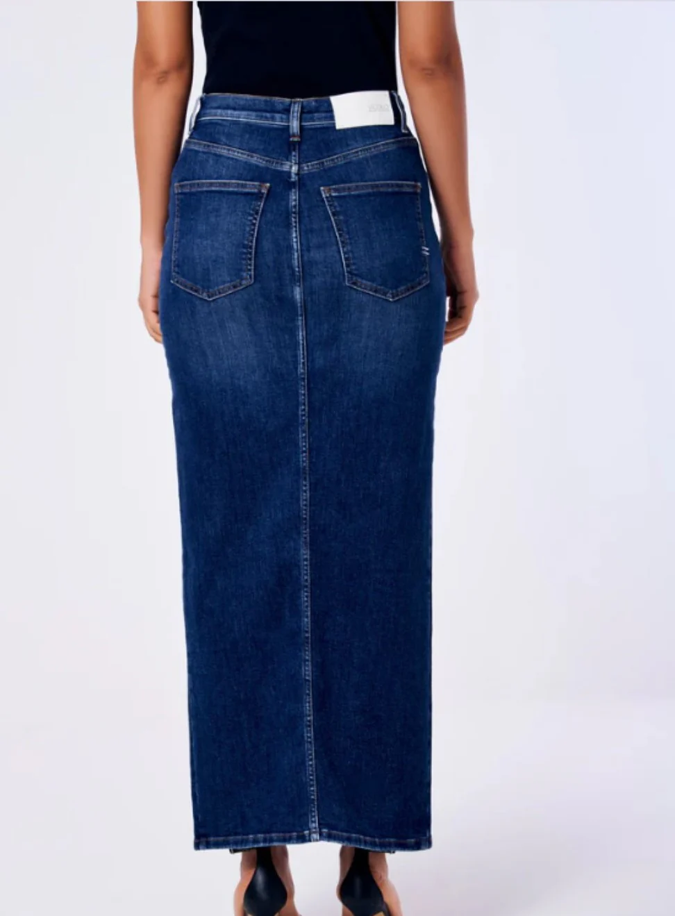 Gonna in Jeans a vita alta con spacco frotnale. Dettaglio bottoni dorati frontali. Tasche posteriori. Chiusura con cerniera e bottone.