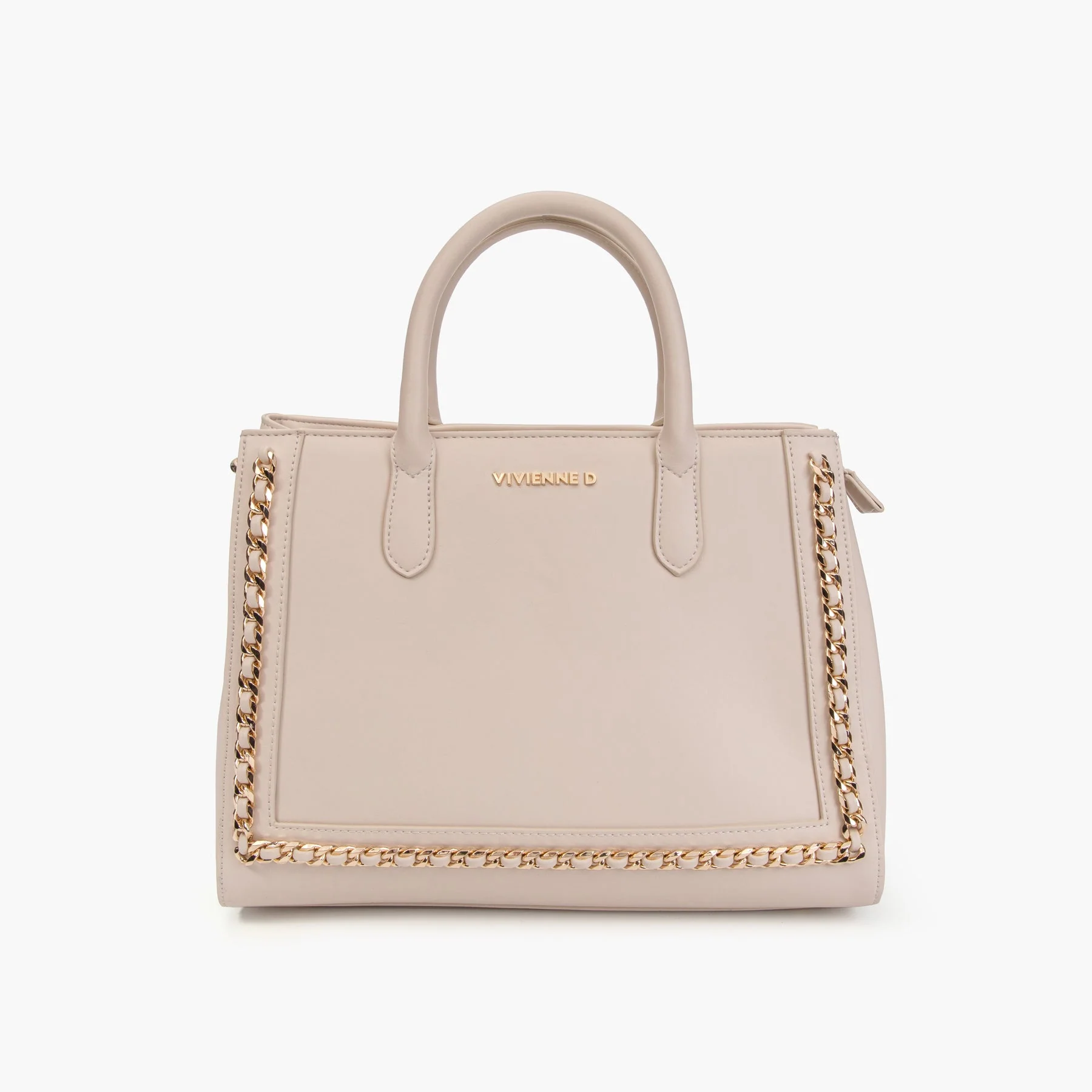 Vivienne D. donna borsa v087 beige Dimensioni: 32x25x10 ca Borsa in ecopelle Catena decorativaDoppio manico Chiusura con zip Scomparto centrale con zipDue tasche interne di cui una con zip Tasca posteriore con zip Tracolla removibileLogo VIVIENNE D finitura dorataFodera 100% poliestere